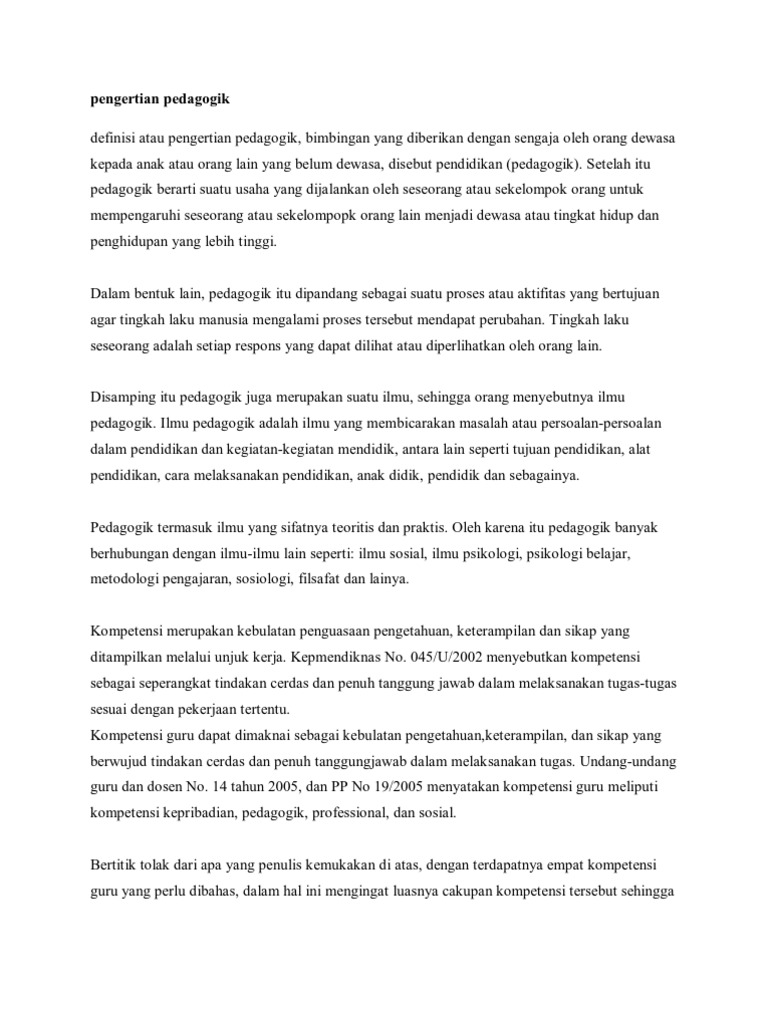 Pengertian Pedagogik Seorang guru dalam menjalankan tugasnya sebagai pendidik di sekolah perlu memiliki seperangkat ilmu tentang bagaimana ia harus mendidik anak. Pengertian Pedagogik Secara Bahasa Etimologi dan Para Ahli Pedagogik merupakan kajian pendidikan secara etimologis berasal dari kata Yunani paedos yang berarti anak laki-laki dan agogos yang berarti mengantar membimbingJadi pedagogik secara harfiah berarti pembantu anak laki-laki pada jaman Yunani kuno yang pekerjaannya mengantarkan anak majikannya ke sekolah. Kompetensi Pedagogik yaitu kemampuan seorang guru dalam mengelola proses pembelajaran peserta didik.